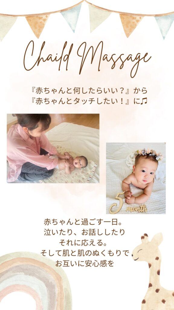 いろんなマッサージの本を見て行うのもOKですが、専門的な肌ケア、そして人間の土台となるアタッチメント形成の方法や赤ちゃんだけでなくその先の子どもとの関わり方や生教育も含めたチャイルドマッサージを学ぶことで子育てがとても楽しくなっていきます。