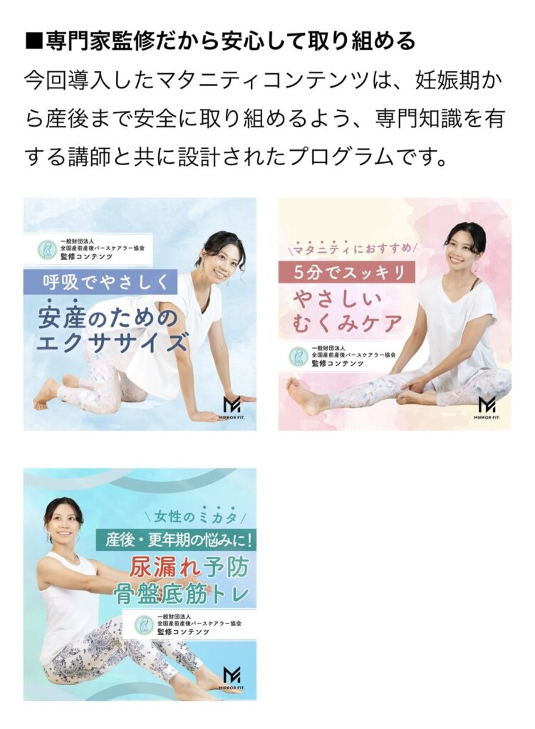 そのノウハウを生かして、ミラーフィットをご利用の方にも安心して産前産後サポートをさせてもらえるように、今回コンテンツを共同で作成致しました。