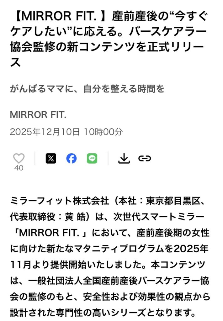 この度、ヒトリウェルネスや自宅で使用できる 『鏡型ディスプレイ×オンラインフィットネス×健康データ管理』を融合した次世代スマートミラーフィットネスシステム”MIRROR.FIT”とコラボレーションし、産前産後エクササイズを監修させていただきました。