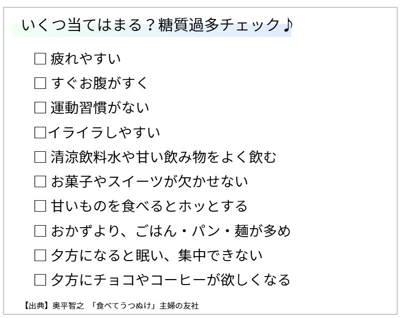 チェックが多かった方は、糖質が多めな食生活で、体が少し不安定になっているサインかもしれません。