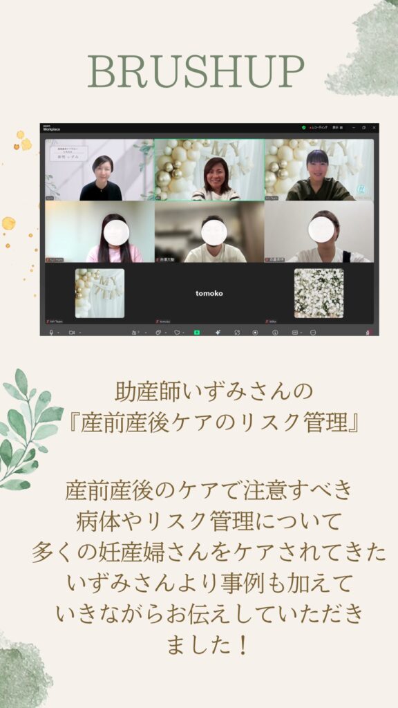 いずみさんは、都内の産前産後のママ向けのサロン『いちえみ』をオープンされており、多くのママ達のケアをされていく中で助産師としての視点から産前産後ケアに関わるサポーターさん達に向けてのリスク管理を伝えてくださり、日々のケアの中で私たちが直面する小さな「気づき」や「違和感」をどう活かすか、そして母子の安全を守るためにどんな視点が必要かを、改めて見つめ直す時間となりました。